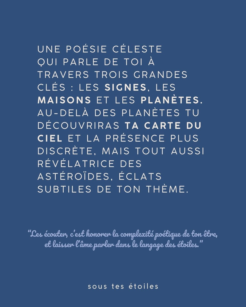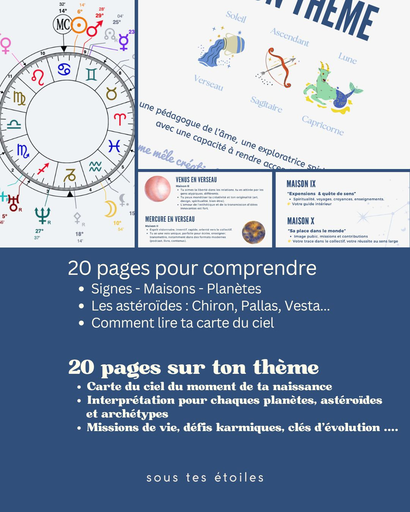 20 pages pour comprendre les signes, les planètes, les maisons, l'infuence subtile des astéroïdes... et 20 pages entièrement personnalisées pour découvrir ta carte du ciel, une interprétation pragmatique et poétique du positionnement de chaques astres, tes missions de vie, tes défis karmiques et tes clés d'évolution.